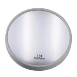 Weißer Kunststoff Spiegel mit 2 Saugnäpfen, 15-fach-Vergrößerung. Ø 13 cm.