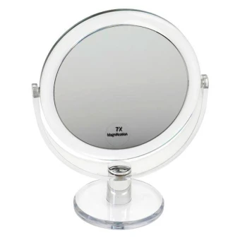 Runder Kosmetikspiegel aus Kunststoff. 1-fach/7-fach Vergrößerung, Ø 16 cm, Höhe 22 cm.